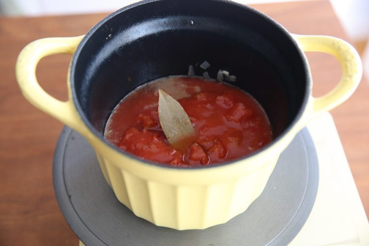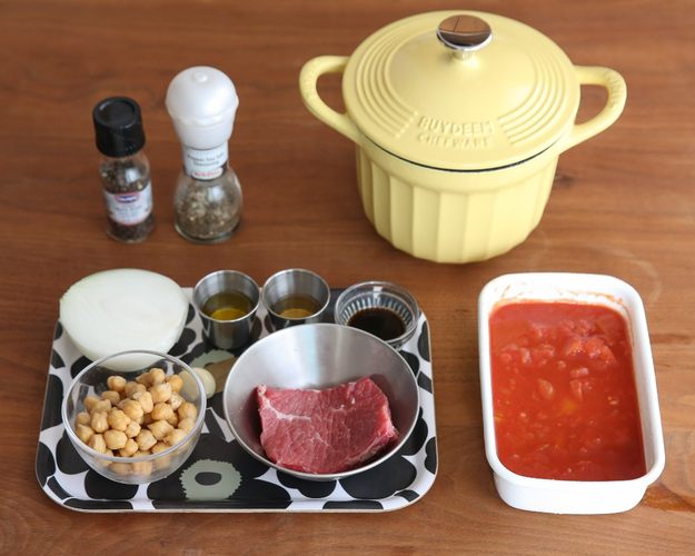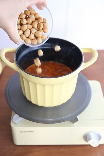 适合搭配面包或米饭的主菜。鹰嘴豆煮至软烂,吸饱番茄酸甜的汤汁太美味啦!用黑珐琅小圆锅炖,盖盖子关火焖煮,聚热保温汤汁更浓郁哦。