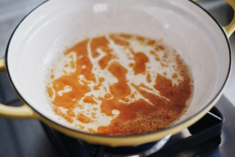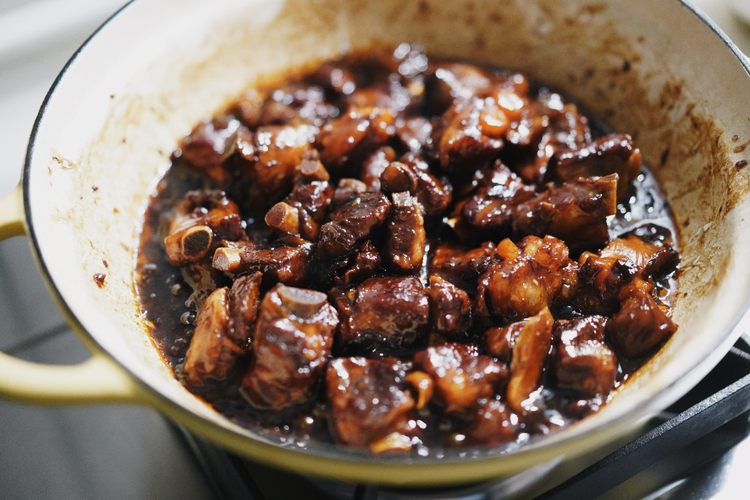 铸铁锅里倒入一点油,然后放入冰糖,中小火炒糖色,炒到糖变成琥珀色下入排骨,让每一个排骨都裹上糖色,然后锅边淋入料酒,翻炒均匀,倒入温水,水和排骨持平即可,再放入姜片,梅子,生抽和老抽,搅拌均匀
