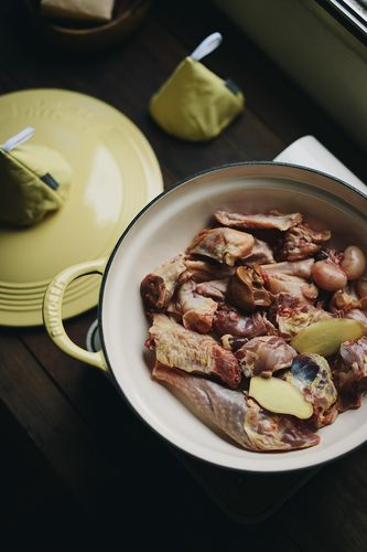 鸡切块洗净,加水生姜煮沸,撇去浮沫炖45分钟(我买的鸡卖家强调了不用焯水哒)