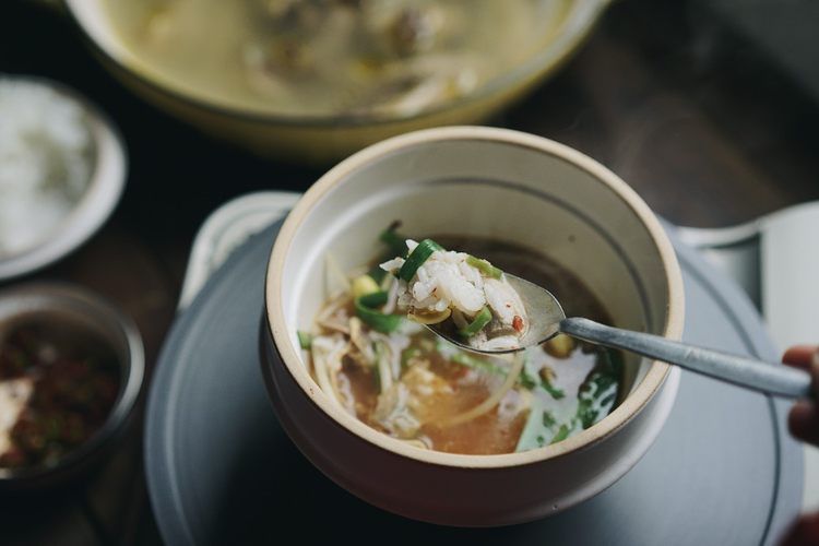 砂锅里加入鸡汤,拆碎的鸡肉,豆芽,煮到豆芽断生后关火,倒入米饭放上调味酱和韭菜就可以开吃