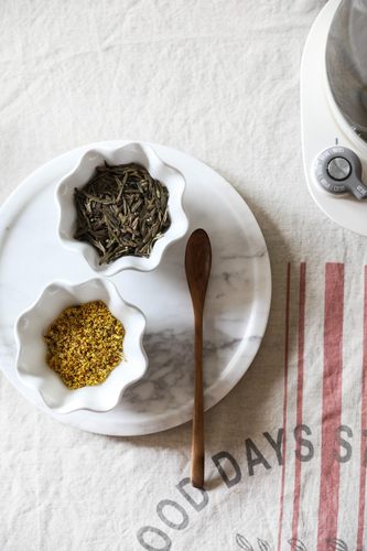 养生壶注入1200ml常温水,分别倒入绿茶和桂花
