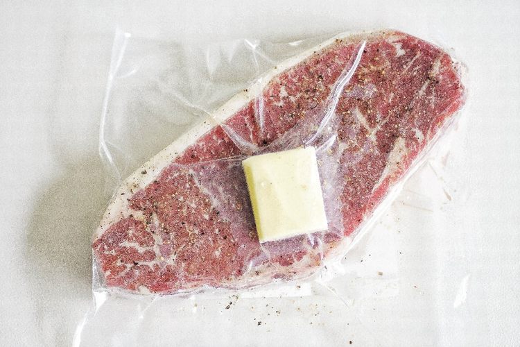 腌制好的牛排和黄油一同装入保鲜袋,抽成真空状态