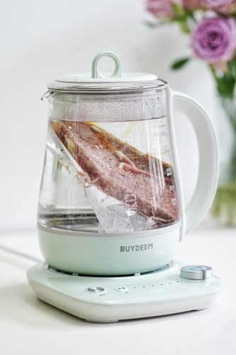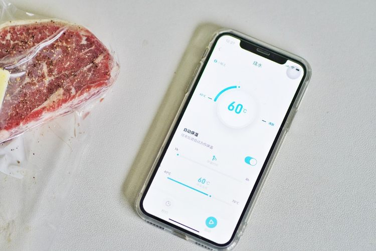 养生壶达到温度发出提示音后,放入牛排。盖上盖子,开始低温慢煮