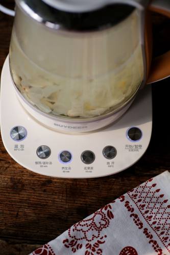 3. 因为银耳比较容易起沫,建议水和汤料一起加至1200ml,否则可能在煮的过程中溢出。