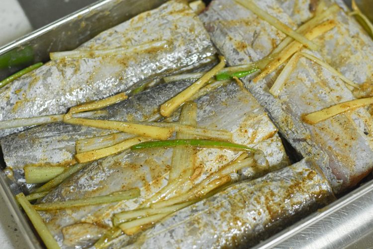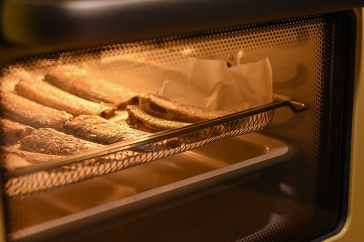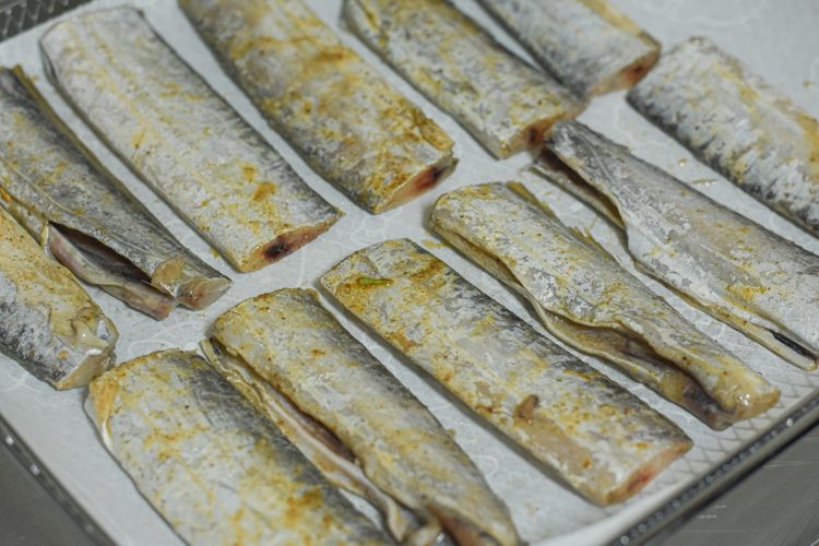 带鱼烘烤过程中会出水,如果鱼段太厚或者出水太多要适当增加烘烤时间