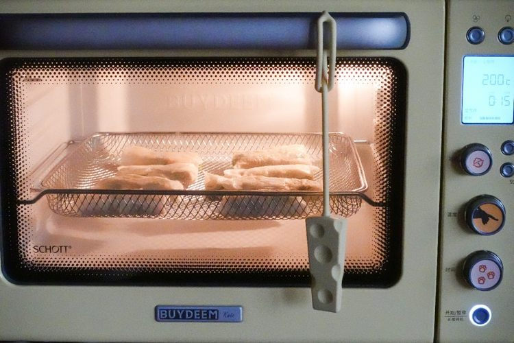 2.以上材料约可以做20个春卷,烤箱一次最多可以排放约12根春卷,吃不完可以包好后放入冷冻保存,从冷冻中取出后可以直接放入烤箱,无需预热,开启空气炸200度烤20分钟。表面可以不刷油,口感也还是脆脆的。