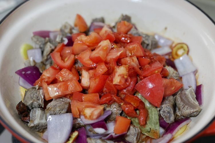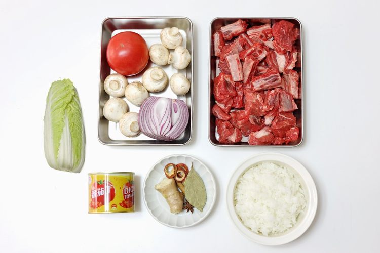 食材:牛腩500克、新鲜番茄1个、罐装番茄200克、口蘑8个、娃娃菜半颗、姜5片、山楂片5片、八角1个、香叶2片、桂皮1小段、一碗熟米饭