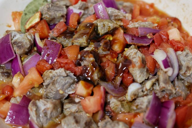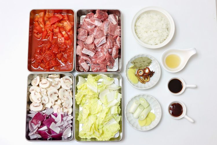 食材改刀:所有食材洗净,牛腩切块浸泡30分钟,再多冲洗几遍;番茄切小块,口蘑切片,洋葱切块,娃娃菜切段;调料:生抽、蚝油、冰糖;另准备少许葱姜料酒焯水用
