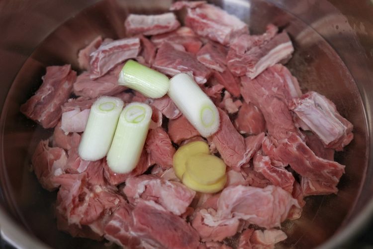 牛腩凉水下锅,加入葱姜料酒焯水煮出杂质和出血沫捞出用热水洗净备用