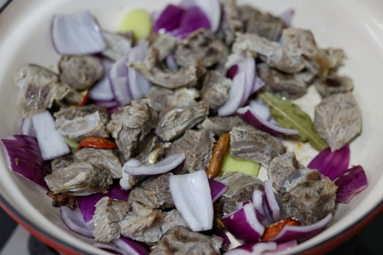 倒入姜、山楂片、八角、香叶、桂皮、洋葱翻炒均匀至有香味
