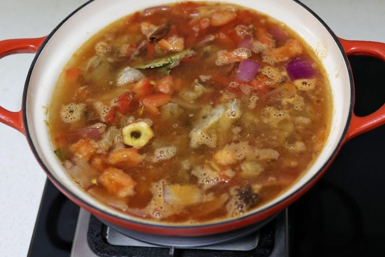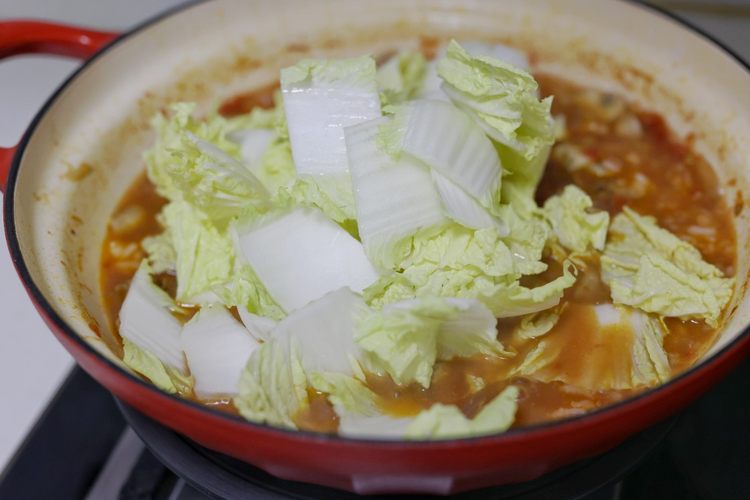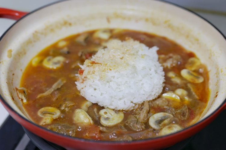 观察锅里的汤汁,如果汤汁少再加点热水,以免后面放入米饭太干太稠