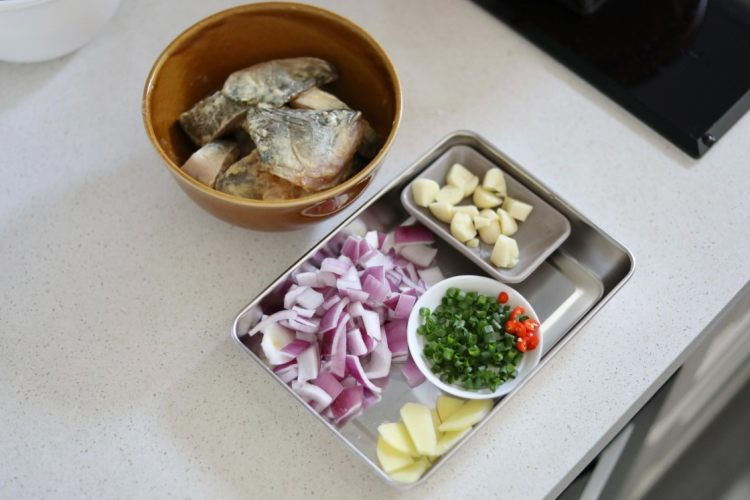 大蒜、洋葱切小块,小葱、小米辣切小段