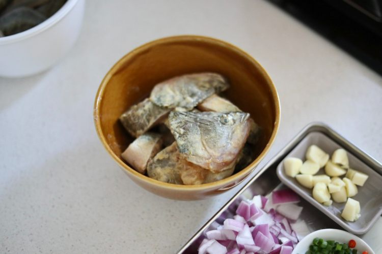 鲈鱼切段,用盐焗粉、10g食用油腌制2小时