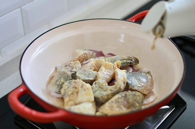 洋葱在底部铺匀,放入腌制好的鱼,沿着锅边淋入2汤勺料酒。盖上锅盖,中小火焗10分钟