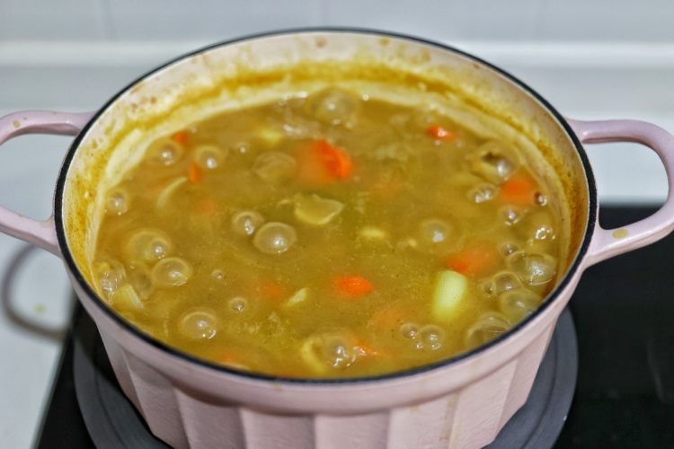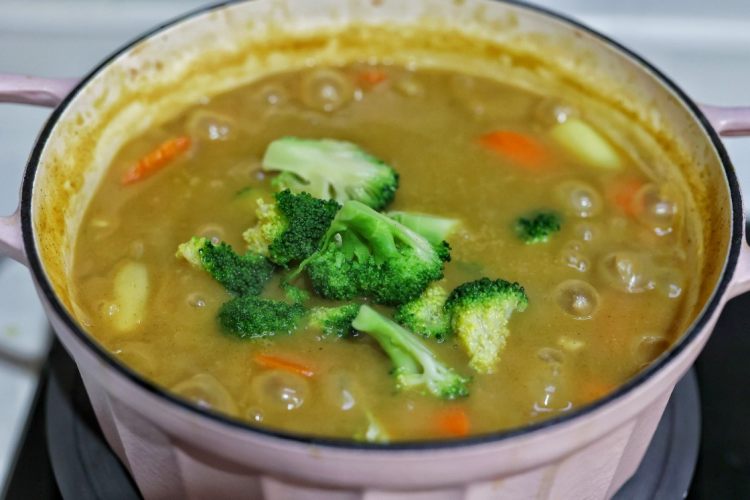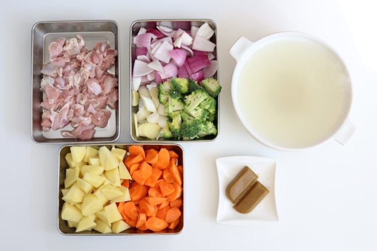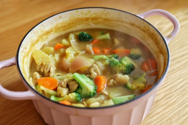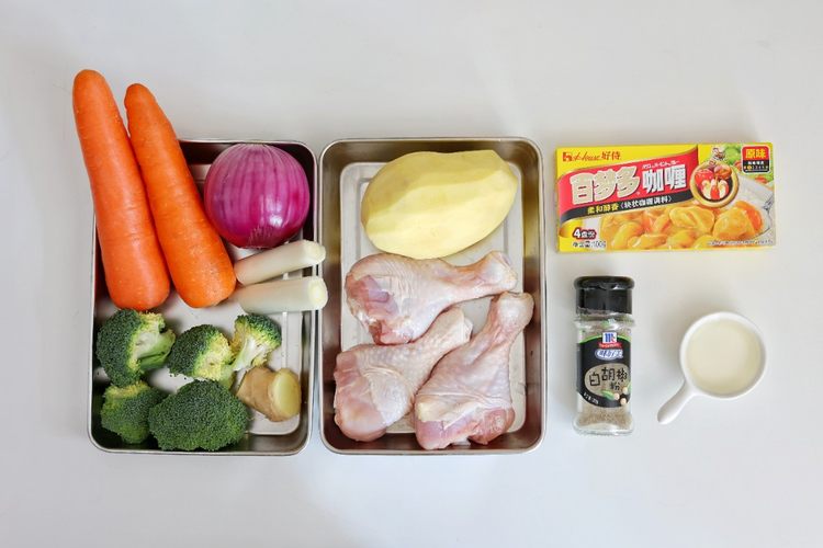 食材:鸡腿3个(琵琶腿)、咖喱100克,胡萝卜2根 、土豆1个、洋葱1个,西蓝花8朵,葱2段,姜3片,鸡汤,食用油10克;腌制鸡腿肉配料:白胡椒1克,料酒5克;煮鸡骨头汤配料:水600克,葱1段、姜3片