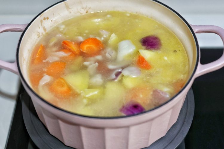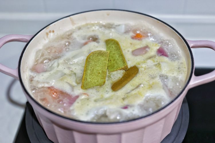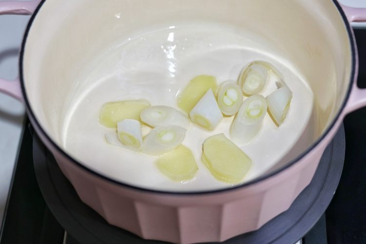 骨头放入锅中加水葱姜煮15分钟,撇去浮沫并过滤碗中备用