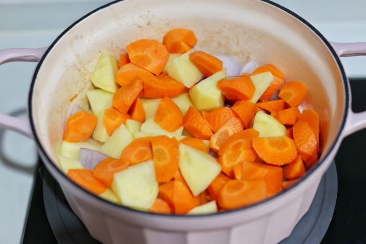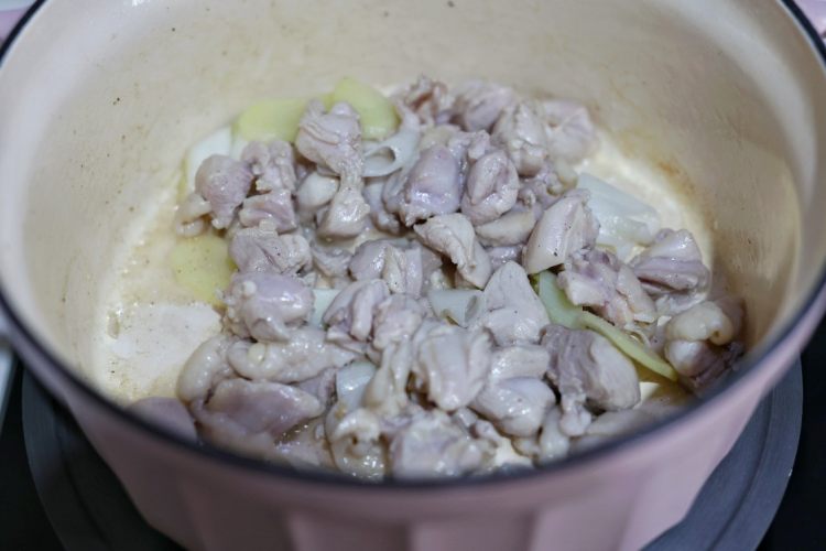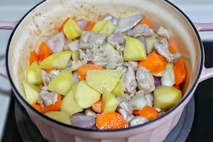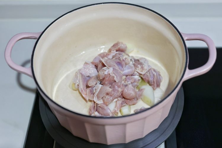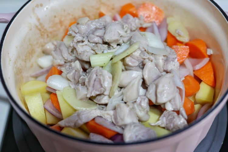 将剔好的鸡腿肉切块,放入料酒,白胡椒抓匀腌制30分钟;西蓝花切小朵,用盐水和小苏打浸泡几分钟后洗净,锅中加水煮开,放少许盐和几滴油倒入西蓝花焯水30秒;胡萝卜和土豆洗净去皮切滚刀块,洋葱切片,葱切小段,姜切片