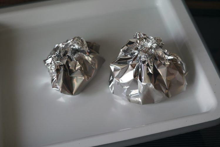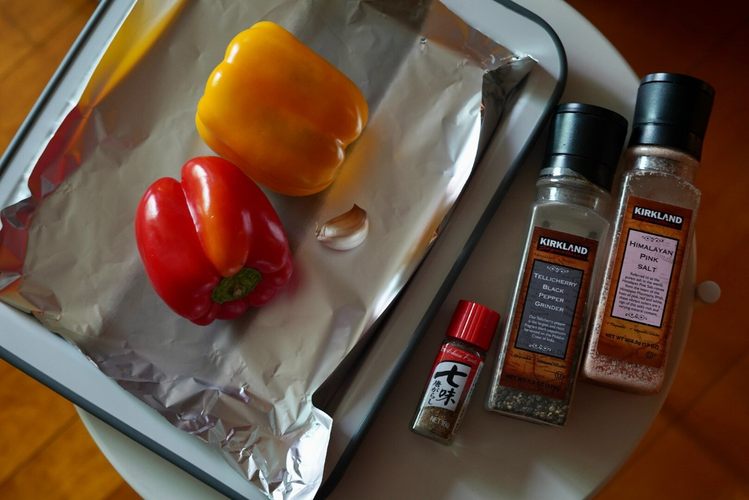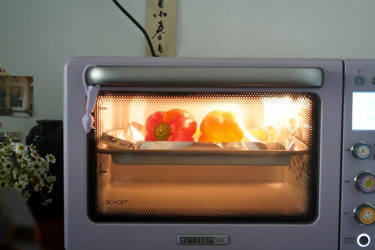 烤箱预热200度40分钟左右(温度、时间视彩椒烤制情况灵活调节),大蒜也一起丢进烤箱烤