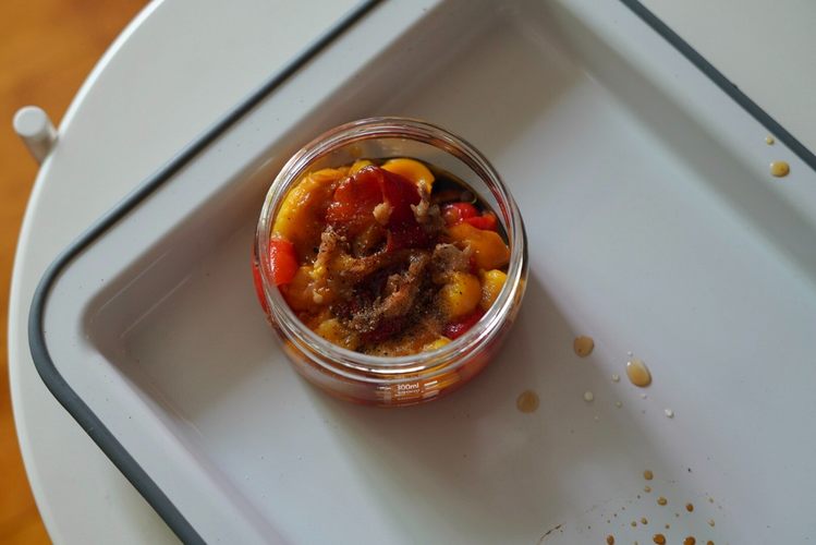 放凉后剥皮去籽,撕成条状装到300ml的北鼎仓鼠罐中,加入烤好的大蒜泥、盐、黑胡椒、橄榄油