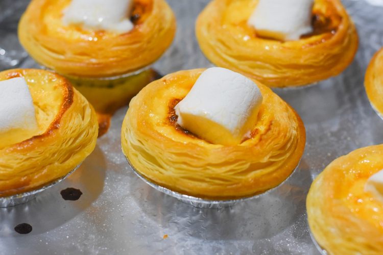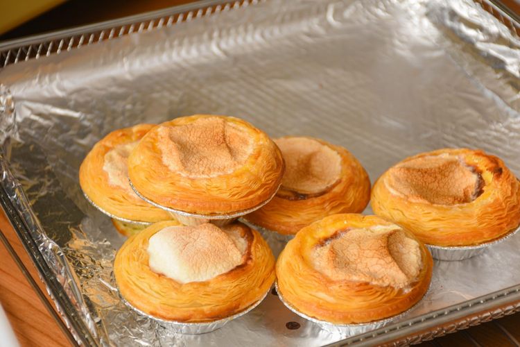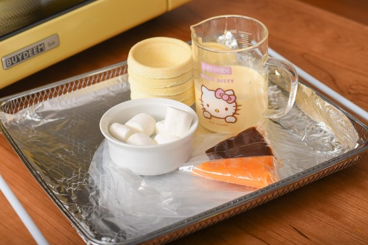准备所有食材:蛋挞皮6个,豆沙馅60g,咸蛋黄酱60g(详见tips),蛋挞液120g,棉花糖6个