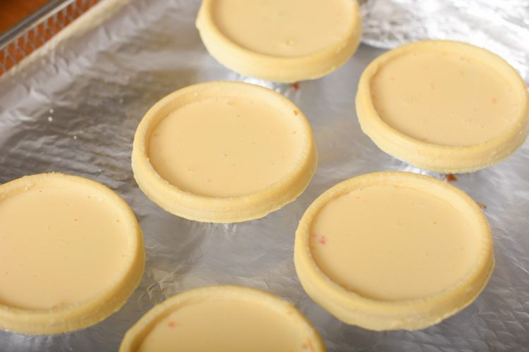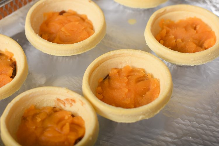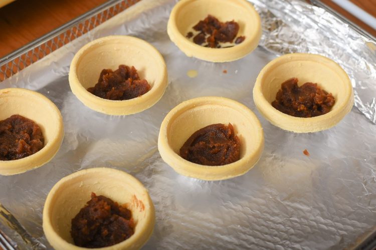 炸篮铺锡纸,蛋挞壳中挤入10g豆沙馅