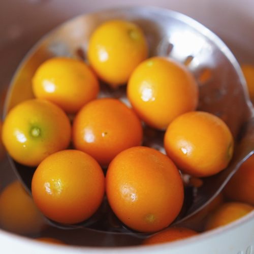 把金桔的蒂摘掉,用盐搓洗金桔表面,煮水,水开后小火煮3分钟金桔