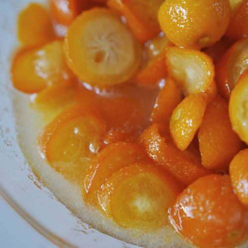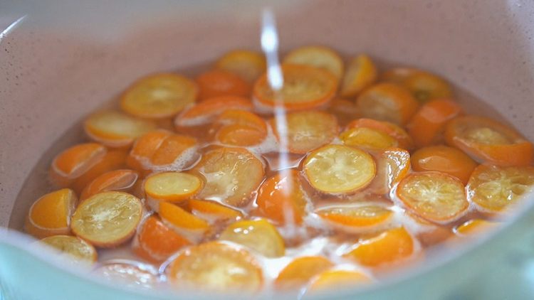 加水放没过金桔,挤入柠檬汁,用中火煮𝟹𝟶分钟左右,到水分基本熬干,熬酱过程中要不断搅拌保证受热均匀