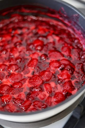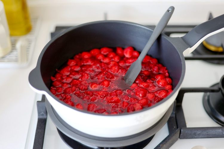 腌制后,草莓和树莓会出一些汁水,放入锅中,中小火煮至冒泡泡