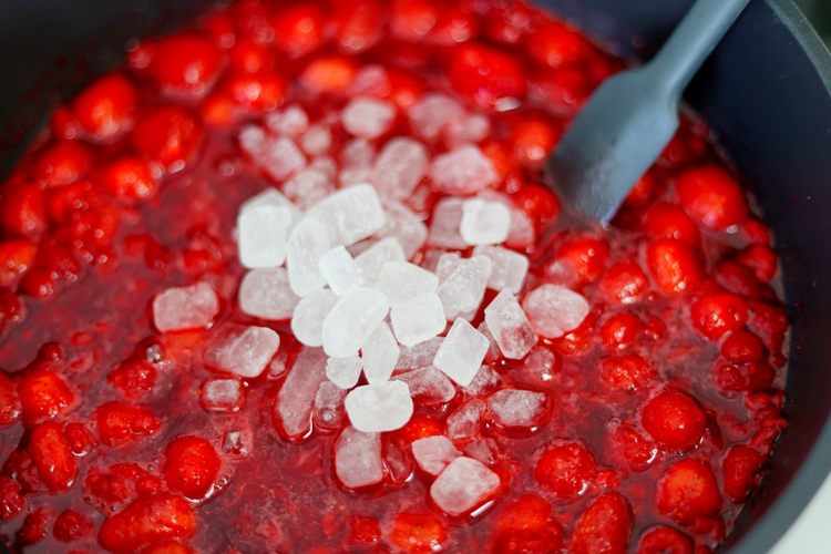 加入冰糖搅拌到糖充分融化,继续不停搅拌到水果浸出汤汁,不用额外添加水