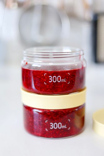 树莓比较酸所以增加了糖的比例,罐子一定要提前消毒才能延长保质期。关于果酱熬成什么状态正好,我的经验是滴一滴果酱液体在盖子上冷却1分钟,竖起后流速缓慢的状态就可以关火了