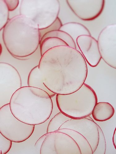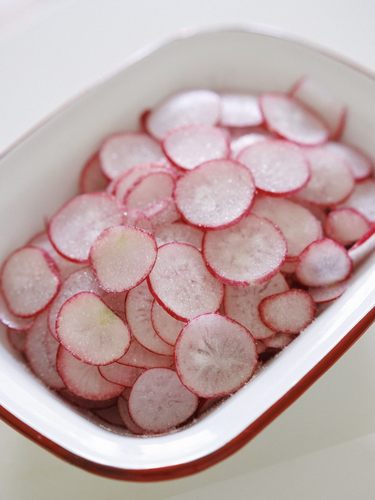 准备食材,将樱桃萝卜洗净,去掉根部并切片