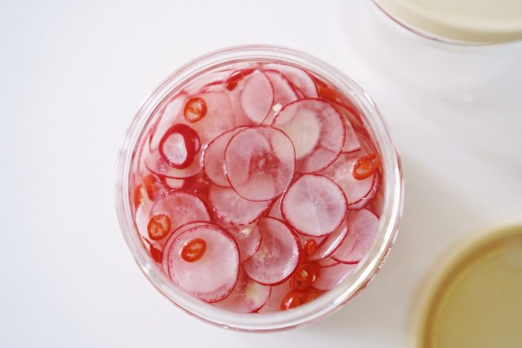 将萝卜片放入储物罐,调好的醋水倒入没过萝卜至少2/3,更方便入味