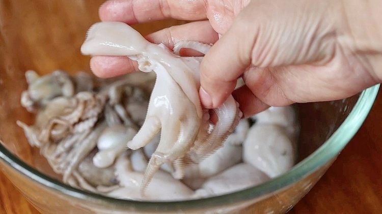 八爪鱼去掉内脏、眼睛、牙齿,撕去表面黑膜,撒少许面粉,清洗干净。把洗净的八爪鱼放入开水中焯水1分钟,捞出放入冷水备用