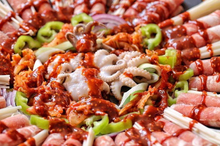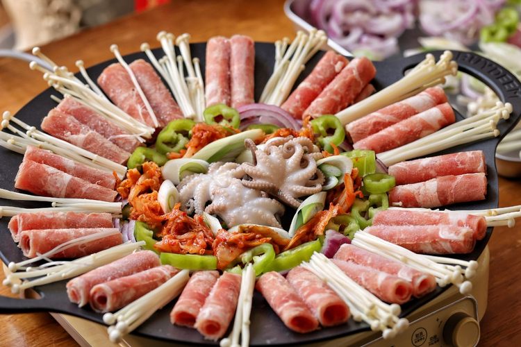 将烤肉锅放在电磁炉上,肥牛卷在烤肉锅保温区码放一圈,内圈依次放一圈洋葱丝、一圈辣白菜、一圈尖椒圈、一圈大葱,最后在烤肉锅煎烤区中心放八爪鱼