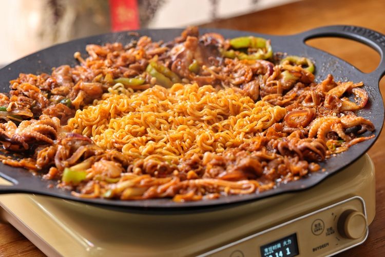 把烤好的肥牛八爪鱼放在锅边保温区,转到火力2档。烤肉锅煎烤区放入煮好的拉面,翻烤1分钟