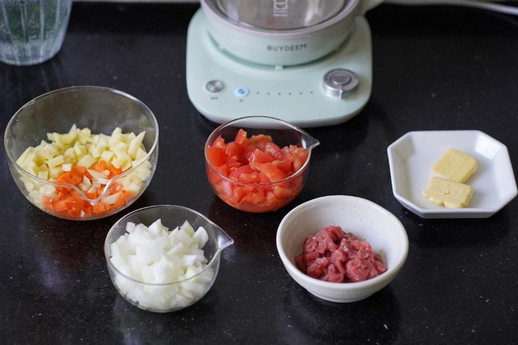 处理食材,西红柿、洋葱、胡萝卜、土豆都切成小丁
