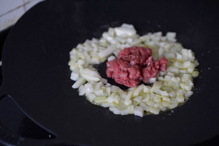 烤肉盘至于灶台上,开中小火。放上黄油,加热融化后倒入洋葱,翻炒1分钟至洋葱变透明后加入牛肉粒继续翻炒。约1分钟后牛肉粒变色,加入西红柿。炒约3分钟炒出西红柿的汁水即可关火