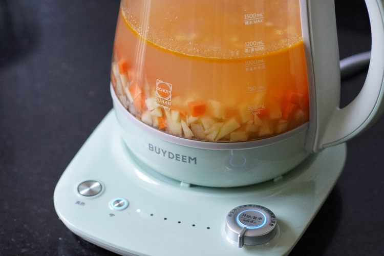 炒好等食材倒入养生壶内,加入胡萝卜、土豆和水,放入盐和糖。连接app,选择单壶-养生汤模式,时间60分钟 开启程序
