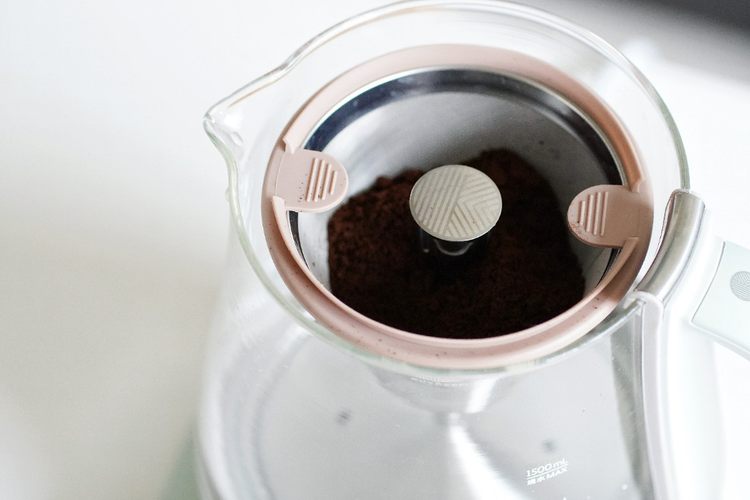 养生壶倒入500ml清水,30g咖啡粉放入萃取篮中,连接app,选择萃取篮-萃煮咖啡模式 时间5分钟,开启程序