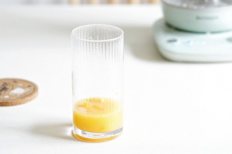 橙子对半切开,切去橙皮,取果肉切碎,倒入杯子里,用勺子按压果肉压出橙汁