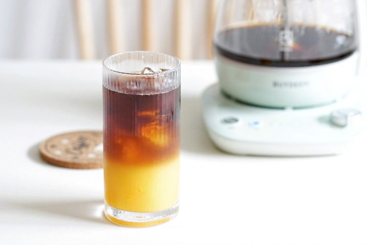 杯内放入冰块(冰块堆到杯子8分处),萃好的咖啡倒在冰块上就可以制造出分层效果,倒至没过冰块即可,喝的时候搅匀就好啦