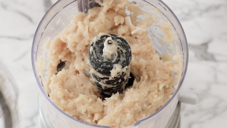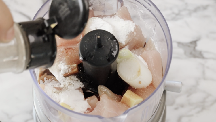 鸡小胸切块后,和姜、葱、玉米淀粉、水、生抽、蚝油、料酒、香油一起放入食物料理机中