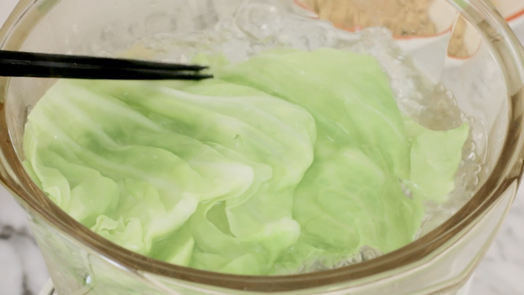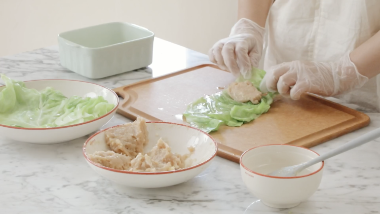 将肉馅儿放入菜叶中卷起来,放入猪猪盒中