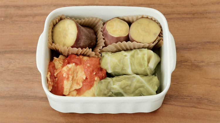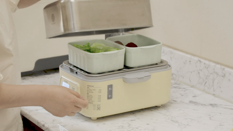 蒸锅程序结束后,将三样菜均匀码放入同一个猪猪盒中,冷却后冷藏即可。食用前微波炉中高火复热4分钟即可