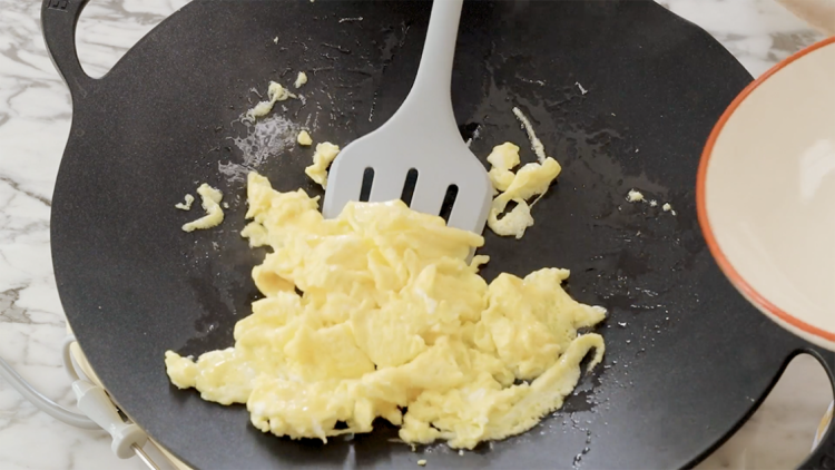 锅中倒入油烧热,倒入鸡蛋液,快凝固时用筷子搅散盛出