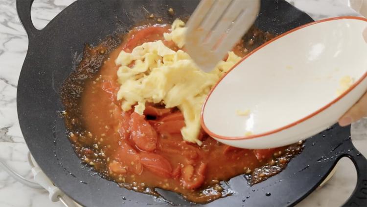 淋入生抽、白糖翻炒,待烧出少许汤汁时倒入鸡蛋拌匀。如果汤汁不多也可以稍微加点水煮一下