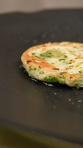 烤肉锅锅底刷少许油,中小火(2档)预热,入饼子(有纹路的那面先煎),要求两面煎至表面硬脆,色泽金黄,即可出锅