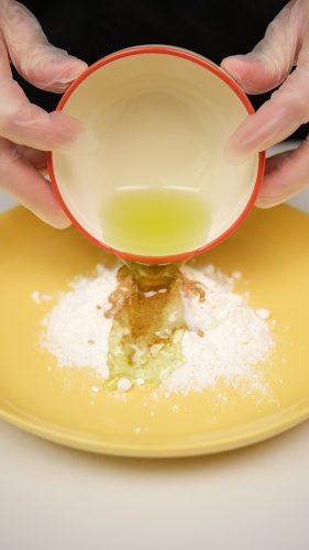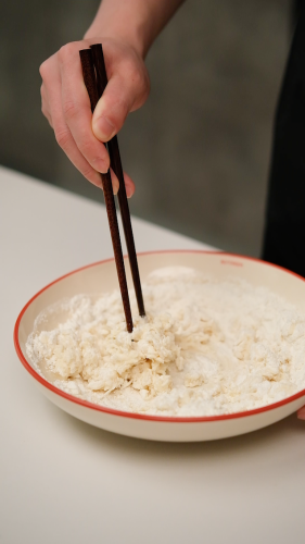 调制油酥。碗中低筋面粉40g,十三香2g,盐2g,葱油和葱绿拌匀,分成3份