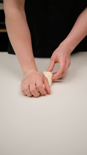 发酵好的面团取出,表面撒粉排气,分成3份。分别包入一个葱油酥,取一份面团擀长,三折叠,再次擀长卷起来,从中间切成2份