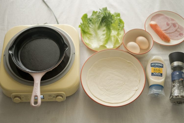 依次铺上生菜叶,火腿片和撕碎的蟹柳丝,挤上蛋黄酱,最后加上鸡蛋,撒上海盐黑胡椒